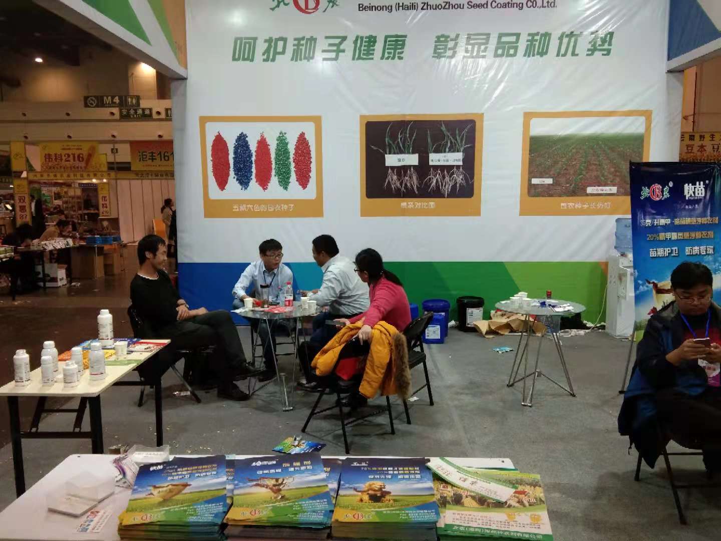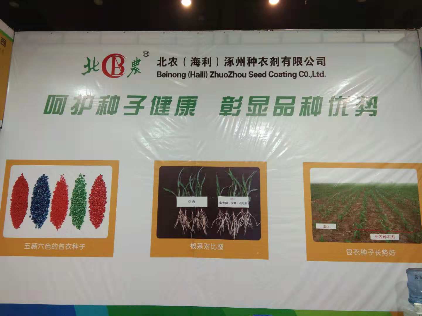 本次會議我公司展出了70%噻蟲嗪干粉種衣劑、40%噻蟲嗪懸浮種衣劑、35克/升精甲咯菌腈懸浮種衣劑、600g/L吡蟲啉懸浮種衣劑、25%多福毒死蜱懸浮種衣劑以及給麗膜。這些產(chǎn)品在防治玉米莖基腐病、苗期多種土傳、種傳病害以及多種刺吸式口器害蟲非常顯著,對于棉花炭疽病,苗期立枯病業(yè)余較好的防效,對于花生地下害蟲,花生死苗防效顯著。
