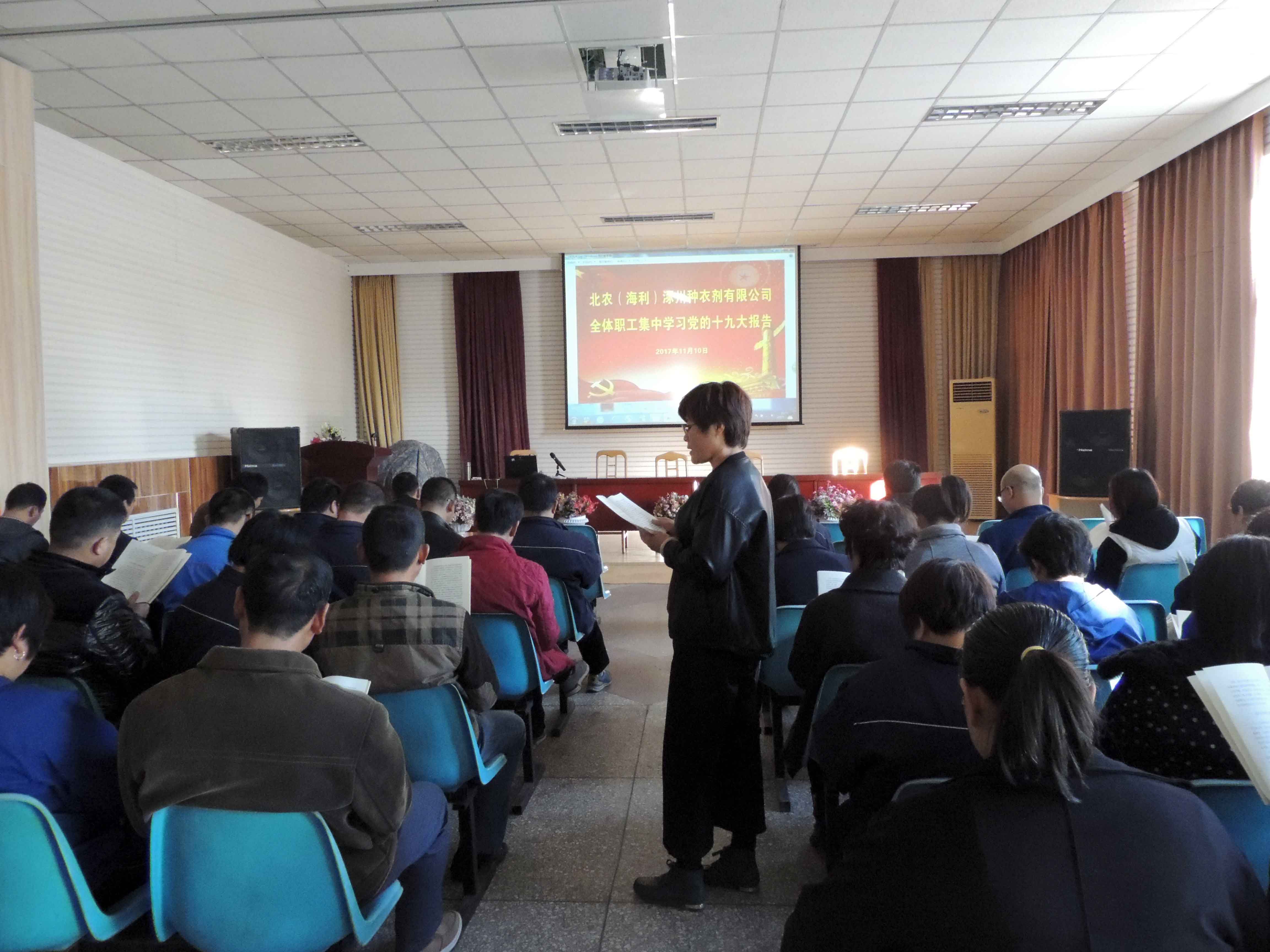 時間:2017-11-17 作者:2017年11月10日下午,為貫徹中國共產(chǎn)黨的方針政策,按照湖南海利集團(tuán)黨委和農(nóng)場黨委要求,公司黨支部組織全體干部職工開展學(xué)習(xí)黨的十九大原文活動,活動分兩個會場進(jìn)行,一個會場是中層以上干部11人在二樓會議室參加湖南海利集團(tuán)黨委組織的視頻學(xué)習(xí),另一個會場是由公司黨支部宣傳委員文麗霞同志帶領(lǐng)50多名員工在大會議室集中學(xué)習(xí),活動中人手一冊黨的十九大報告原文。本次學(xué)習(xí)活動共計66名在單位的干部職工參加。